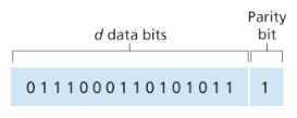 Sigle parity bit를 사용하는 parity checks 기법은 가장 단순한 비트 오류 검출 기법 중 하나이다. Figure 3와 같이 전송하려는 데이터인 D가 d개의 비트로 구성되어 있다고 가정하자. 이때 짝수 parity 방식(even parity scheme)에서는, 송신 노드가 단순히 sigle parity bit를 추가하고, 그 결과인 d+1 개의 비트 전체에서 1의 개수가 짝수가 되도록 parity bit의 값을 정한다. 반대로, 홀수 parity 방식(odd parity scheme)에서는, 1의 개수가 홀수가 되도록 parity bit 값을 설정한다.
