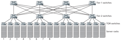 수천 대의 호스트만 수용하는 소규모 데이터센터의 경우, 경계 라우터(border router), 로드 밸런서, 그리고 수십 개의 랙이 단일 이더넷 스위치로 상호 연결된 간단한 네트워크만으로도 충분할 수 있다. 그러나 수만에서 수십만 대의 호스트로 확장하기 위해서는, figure 9과 같은 라우터 및 스위치의 계층 구조가 일반적으로 사용된다. 계층의 최상단에는 경계 라우터가 있고, 이는 접속 라우터(access router)들과 연결된다. 각 접속 라우터 아래에는 세 개의 스위치 계층이 존재한다: