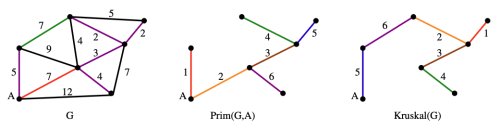 이 과정은 figure 1에 잘 설명되어 있다. 왼쪽 그림은 원래 그래프 G를 의미한다. 가운데 그림은 정점 A에서 시작해서 MST를 점차 확장한 것이다. 오른쪽 그림은 MST를 형성하는 다른 알고리즘인 kruskal 알고리즘을 G에 적용한 결과이다.