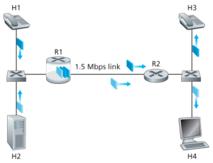Figure 1은 두 개의 패킷 흐름이 하나의 LAN에 속하는 호스트 H1과 H2에서 시작되어, 다른 LAN에 있는 호스트 H3와 H4로 향하는 단순한 네트워크 시나리오를 보여준다. 두 LAN의 라우터는 1.5 Mbps 링크로 연결되어 있다. LAN 속도는 1.5 Mbps보다 훨씬 빠르다고 가정하고, R1 라우터의 출력 큐에 초점을 맞추자. 이때 H1에서 R2로 가는 1.5 Mbps 링크를 1 Mbps VoIP 애플리케이션과 HTTP 웹 페이지를 다운로드하는 애플리케이션이 공유한다고 가정하자.