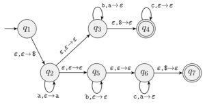 즉, a,b,c의 개수 관계가 i=j 또는 i=k인 문자열을 인식한다. 아래는 Figure 1에 나타난 PDA에 대한 설명이다: