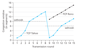 TCP Reno는 fast recovery를 이용하는 TCP 버전이며, TCP Tahoe는 fast recovery를 사용하지 않는다. timeout이던 3번의 중복 ACK던 무조건 cwnd를 1MSS로 줄이고 slow start 상태로 전환한다. 오른쪽의 그래프는 TCP Reno와 TCP Tahoe의 차이점을 잘 보여준다.