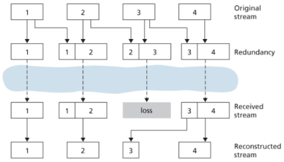 FEC을 구현하는 또다른 방식은 저해상도의 오디오 스트림을 함께 전송하는 방식이다. 송신자는 두 종류의 고품질 스트림과, 저해상도의 스트림을 생성한다. 이를 위해서 각 n 번째 패킷은 고품질 스트림의 n 번째 청크와, 저해상도 스트림의 n - 1 번째 청크를 결합하여 전송한다. 이렇게 하면 비연속적인 패킷 손실(non-consecutive loss)이 발생했을 때, 다음 패킷에서 이전 청크의 저해상도 버전을 재생하여 손실을 은폐할 수 있다. 이는 손실이 발생하더라도 성공적으로 낮은 품질의 대체 음성을 제공할 수 있다는 점, 전체의 재생 품질이 개선된다는 점, 저해상도의 청크는 작기 때문에 추가적인 전송 부담이 적다는 점, 두 개의 패킷만 있으면 재생이 시작되므로 재생 지연이 작다는 점에서 장점을 가진다.