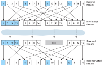 Interleaving은 오디오 데이터의 순서를 재배열하여 전송하는 방식이다. 이는 인접한 오디오 단위들을 멀리 떨어지게 배치하여 하나의 패킷이 손실되더라도 여러 지점에 짧은 간격의 손실만이 발생하도록 하는 원리이다. 예를 들어, 오디오 스트림이 5ms 단위의 데이터 조각으로 나뉘고, 하나의 청크가 20ms 분량이라고 가정하자. 이 경우 각 청크에 저장되는 오디오 스트림 단위의 번호는 아래와 같다: