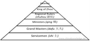 주 왕(King of Zhou)**은 단순한 군사 지도자가 아니라, 의례(ceremonies)와 행정 명령(written appointments)을 통해 권위를 행사했다. 또한 서기관(scribes)과 의례적 서열(ritual hierarchy)를 관리함으로서 각 지역에 대한 통치를 했다. 즉, 제례(宗廟·제사)와 문서 행정이 결합된 중앙집권적 정치 체제였다. Figure 3는 주나라의 중앙 집권적인 계급 체계를 보여 준다.
