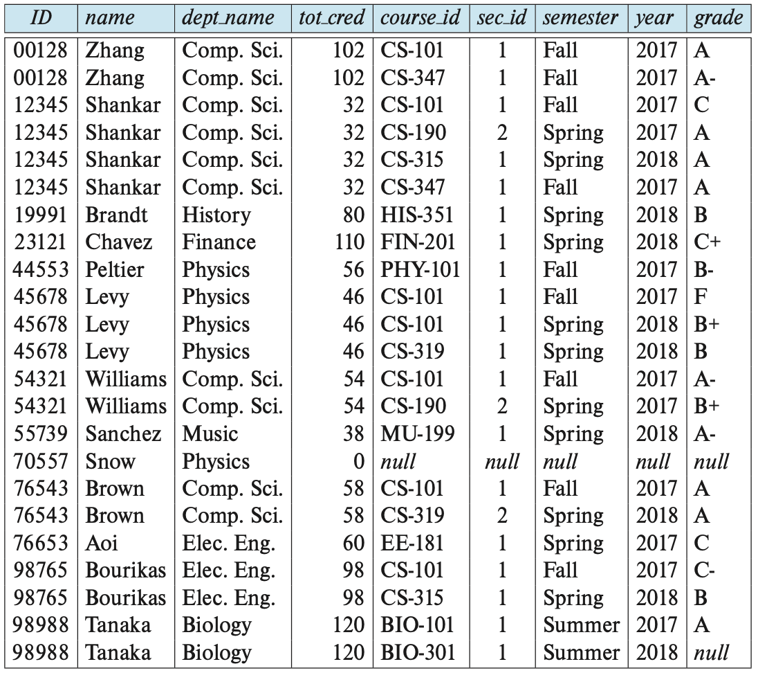 Result of student natural left outer join takes.