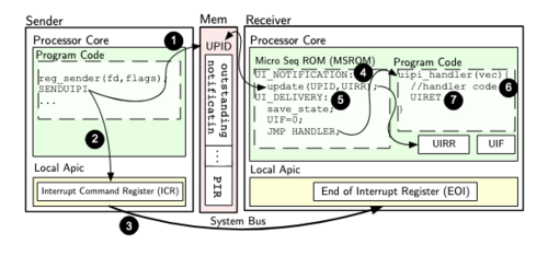 User-interrupt는 senduipi [UITT Index]명령어를 사용해서 보낼 수 있다. 이 명령어는 UITT에서 해당하는 Index의 UPID를 검색하여 PIR field에 On으로 마킹하고 (Conventional)IPI를 NDST의 APICID에 해당하는 코어에 NV값과 함께 보낸다. IPI가 도착하면, receiver core는 MSR레지스터의 UINV를 참고해서 UIPI notification vector와 일치하는지를 검사한다. 만약 일치하면, UPID의 PIR값을 참고해서 이 UIPI가 만약 코어에서 돌아가고 있는 thread와 일치하면 바로 thread에 UIPI를 전송하지만, 만약 불일치하면 OS를 통해서 인터럽트를 대상이 되는 thread를 context switch하고 보내게 된다. 커널은 다음 scheduling time에 해당하는 thread의 Local APIC을 통해서 self-UIPI형식으로 보내준다. Interrupt가 지속적으로 들어와서 전체 시스템을 Slow down시키지 못하게 하도록 위해서, Suppressed Notification (SN)bit field를 UPID에 지정할 수 있도록 하여서, Thread가 만약 Context out되어 있고 아직 Pending UIPI가 있으면, Kernel이 SN bit을 On시켜서 더이상 UIPI가 대상 thread에 오지않도록 할 수 있다.