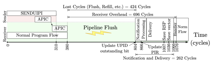 UIPI가 전송되면, Sending core는 UITT에서 UPID의 목적지를 검색하고 기존의 IPI를 목적지 코어에 전송하여, Pending UIPI가 도착했음을 전송한다. Receiving core는 UPID를 활용해서 최종적으로 UIPI를 전송한다. UPID는 모든 코어가 공유하고 있기 때문에, 각각의 코어들은 UPID를 참고하여 UIPI를 처리할 수 있다.
