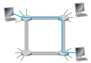 Circuit Switching Network에서는 source와 destination간의 통신을 위한 경로의 resource[6]를 통신 전에 미리 reserve한다. 이러한 특성은 예약된 자원이 오로지 예약된 통신만을 위해 사용되기 때문에 항상 빠르고 안정적인 통신이 가능하다. 예를 들어서 위 그림에서 host간의 통신을 위해서는 2개의 링크에서 각각 1개의 circuit(회선)을 예약해야 한다. 이 경우에서는 첫 번째 링크에서는 2번째 회선이, 두 번째 링크에서는 네번째 회선이 사용되었다.[7]