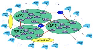 이때 a network of networks는 매우 복잡한 구조로 발달하였다. 이는 네트워크 간의 연결이 ISP의 숫자가 매우 늘어난 것 외에도 경제성, 국가 간의 정치적인 지형에 의해 영향을 받았기 때문이다. 결국 a network of networks는 계층적인 구조로 발달하였다. | |||