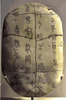 갑골문(Oracle bones)은 거북 등껍질·짐승 뼈에 질문을 새기고 불에 지져 금이 가는 모양을 해석하는 방식으로 점(divination)을 치는 데에 사용되었다. 예를 들면, “부호(Lady Hao)의 출산이 길할 것인가?”과 같은 질문이다. 이에 대한 점괘/예지(Prognostications)은 왕이나 제사관(diviner)에 의해서 기록되었으며, 이는 중국 최초의 역사 기록이다. Figure 5는 갑골문 유물들의 사진이다.