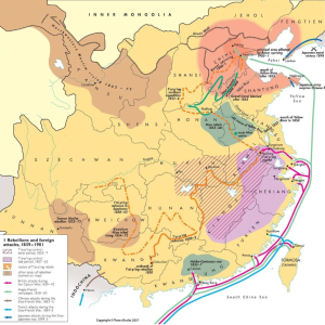 이를 계기로 청나라는 19세기 들어 동시다발적인 각종 내란과 외세 침략에 의해서 시달리게 된다. Figure 3은 19세기 청 제국의 내란과 외세 침략이 동시다발적으로 일어난 상황을 시각화한 것이다. 보라색은 태평천국의 난, 주황색 지역은 다른 반란들이 일어난 지역, 파랑/보라색 화살표는 영국, 프랑스, 일본의 침공 경로를 보여준다.