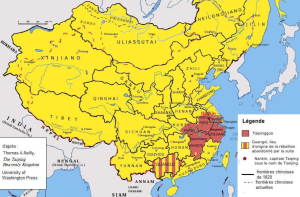 Figure 6은 1854년경 태평천국이 장악한 영토를 보여준다.[2][3] 태평천국은 1853년 남경(南京)을 점령하고 “천경(天京)”으로 개명, 수도로 삼았다. 태평천국은 당시 인구 약 3천만 명을 지배하며, 한때 청 제국의 절반 이상을 위협했다. 하지만 약 2천만 명 이상의 사망자를 낸 끝에, 결국 난은 내부분열과 외세(서양)의 개입으로 1864년에 태평천국은 결국 진압되었다.