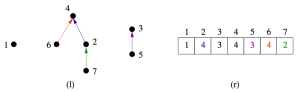이를 구현하기 위해서 각 집합(set)은 하나의 트리로 표현된다. 이때 각 트리의 루트 노드(root)가 해당 집합의 “대표 이름(name of the set)”에 해당한다. 또한 각 노드는 “부모 포인터(parent pointer)”를 가지므로, 각 원소는 자신의 부모를 알고 있고, 루트는 자기 자신을 부모로 가진다. Figure 2은 이를 잘 보여준다. 왼쪽의 각 트리 자료구조는 각각의 집합을 나타내며, 오른쪽 그림은 각 원소의 부모는 나타내는 배열 p[i]를 보여준다. | |||