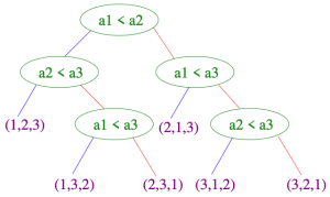 # 높이가 h인 이진 트리의 리프 수는 최대 2<sup>h</sup>이므로, <math>n! \le 2^h \rightarrow h \ge log(n!)</math> | # 높이가 h인 이진 트리의 리프 수는 최대 2<sup>h</sup>이므로, <math>n! \le 2^h \rightarrow h \ge log(n!)</math> | ||