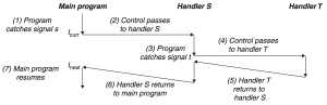 - 예를 들어 handler는 단순히 global flag를 설정하고 즉시 반환하도록 만들 수 있다. signal 수신과 관련된 모든 처리를 메인 프로그램에 위임하는 것으로 구현 가능하다.[21]