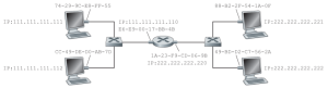 이렇게 상황이 주어졌을 때, 호스트 111.111.111.111이 호스트 222.222.222.222로 IP 데이터그램을 보내고자 한다고 가정하자. 이때 어댑터가 사용하는 MAC 주소는 수신측 호스트의 MAC 주소인 49-BD-D2-C7-56-2A가 아니다. 이는 만약 송신 어댑터가 해당 MAC 주소를 사용한다면, 서브넷 1에 있는 어떤 어댑터도 이 프레임을 자신의 MAC 주소와 일치하지 않는다고 판단하여 프레임을 네트워크 계층으로 전달하지 않기 때문이다. 따라서 111.111.111.111에서 222.222.222.222로 데이터그램이 전송되기 위해서는 우선 라우터 인터페이스 111.111.111.110으로 전달되어야 하므로, 사용되는 MAC 주소는 해당 인터페이스의 주소인 E6-E9-00-17-BB-4B이다.[3] 이를 사용하여 프레임으로 캡슐화된 데이터그램은 송신 호스트로부터 서브넷1에 전송된다. 서브넷 1에 있는 라우터의 어댑터는 프레임의 MAC 주소가 자신의 것이라는 것을 감지하고, 프레임을 라우터의 network layer로 전달한다. 라우터는 데이터그램이 어떤 인터페이스를 통해 전달되어야 하는지를 forwarding table을 이용해 결정하며, 이에 따라 해당 데이터그램을 어댑터에 전달한 후, 이를 새로운 프레임으로 데이터그램을 캡슐화하여 서브넷 2로 전송한다. 이때 프레임의 목적지 MAC 주소는 최종 목적지 호스트의 MAC 주소가 된다.[4]