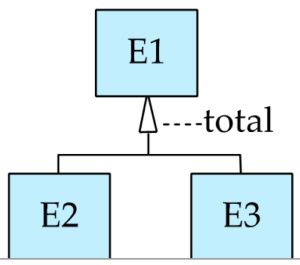 이때 partial specialization이 기본 상태이다. total specialization을 따로 표시하기 위해서는 오른쪽 그림과 같이 다이어그램에 “total”이라는 키워드를 추가하고, 해당 키워드에서 점선을 적용되는 hollow arrowhead 또는 여러 개의 화살표 집합[1]으로 연결한다.