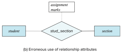 또한 위는 다중값 속성(multivalued attribute)이 필요한데 단일값(single-valued attribute)으로 모델링하는 오류를 보여준다. 위의 상황에서는 takes(student, section) 관계에서 학생이 과제별로 점수를 받으며, 이것이 assignment, marks라는 두 개의 단일 속성을 추가해서 표현되고 있다. 이는 각각의 section과 student 쌍의 관계당 단 하나의 과제 점수만 기록가능하므로, 과제가 여러 개인 경우에는 표현이 불가능하다는 단점이 있다. 이를 해결하는 두가지 방법이 존재한다.