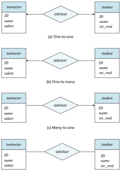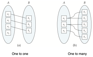 - one-to-many: A의 한 entity는 B의 여러[8] entity와 연관된다. 그러나 B의 한 entity는 A의 최대 하나의 entity와만 연관된다.