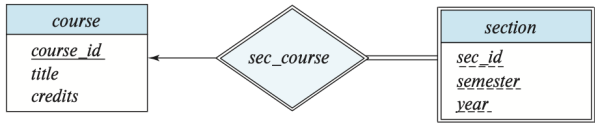 위의 이미지에는 전공 과목을 의미하는 course와, 그의 각 분반을 의미하는 section entity가 존재한다. 또한 각 course는 해당하는 section에 속해있으므로, 이러한 relation을 의미하는 sec_course가 존재한다. 하지만 이 경우에는 redundancy 문제가 존재한다. section은 course_id라는 attribute를 이미 가지고 있기 때문에 sec_course라는 relation 없이도 어떤 course에 속하는지 알 수 있기 때문이다. 이러한 문제를 해결하는 하나의 방법은 sec_course relation을 없애는 것인데, 이 경우 section과 course과의 관계가 implicit하게 지정되므로, 바람직하지 않다. 또 다른 방법은 section에서 course_id attribute를 없애는 것인데, 이 경우는 course_id가 section에서 primary key의 원소 중 하나이기 때문에 section의 primary key가 더 이상 존재하지 않는다는 문제가 있다.