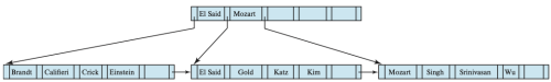 Figure 10은 nstructor 파일에 대한 완전한 B+-트리를 보여준다(n = 4). 단순화를 위해 null 포인터는 생략하였으며, 화살표가 없는 포인터 필드는 null 값으로 간주한다. Figure 11은 instructor 파일에 대한 또 다른 B+-트리를 보여주는데, 이 경우 n = 6이며, 이 트리의 높이는 n = 4인 트리보다 낮다. 위에서 예시로 제시된 트리들은 모두 균형 트리(balanced tree)이며, 이는 root 노드에서 leaf 노드까지의 모든 경로가 동일하다는 것을 의미한다. 이 속성은 B+-트리의 필수 요건이며,[5] 이는 여러 파일 갱신 작업에 대해 우수한 성능을 제공한다.