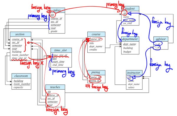 - 예시: instructor relation에 존재하는 dept_name은 department relation의 primary key이므로 instructor의 foreign key이다.