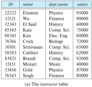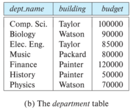 오른쪽의 그림은 두개의 표로 구성된 Relational Model의 예시이다. 첫번째 테이블인 instructor 표에서는 ID가 22222인 Einstein 교수가 물리학과 소속이며, 연봉이 95,000달러임을 나타낸다. 두 번째 테이블인 department 테이블에서는, 예를 들어, 생물학과가 Watson 건물에 위치하고 있으며, 예산이 90,000달러임을 나타낸다.