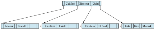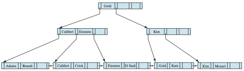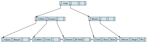 이 에제에서는 삭제당한 노드의 항목들을 왼쪽에 존재하는 형제 노드로 옮기고, 비어있는 오른쪽의 형제 노드를 삭제할 수 있다. 이때 노드가 삭제되면, 해당 노드를 가리키고 있던 부모 노드의 항목들도 삭제해야 한다. 예제에서 삭제할 항목은 (Srinivasan, n3)이고, n3은 “Srinivasan”이 들어 있는 leaf를 가리킨다. 해당 항목을 삭제하면, 부모 노드는 “Srinivasan”과 두 개의 포인터를 가졌던 상태에서 이제 하나의 포인터만 남게 되며, 검색키 값은 없어진다. n = 4이므로 1 < ⌈n/2⌉가 되어 부모 노드 역시 부족해진다. 이 경우 부모의 형제 노드를 살펴야 한다. Figure에서 형제 노드는 “Califieri”, “Einstein”, “Gold”를 포함하는 non-leaf 노드이다. 이때 이 노드와 병합하고 싶지만, 이 경우 포인터가 총 5개가 되어 최대값인 4를 초과하므로 병합할 수 없다. 따라서 포인터들을 재분배하여 두 노드가 최소 ⌈n/2⌉ = 2개의 자식 포인터를 갖도록 한다.
