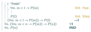 따라서 모든 n에 대해 “n보다 작은 모든 수에 대해 성립하면 [math]\displaystyle{ P(n) }[/math]도 성립한다"가 참이면, 전체적으로 [math]\displaystyle{ \forall n.P(n) }[/math]또한 참이라는 것이다. 이는 figure 2와 같은 꼴을 통해 fitch style로 나타내어 진다.